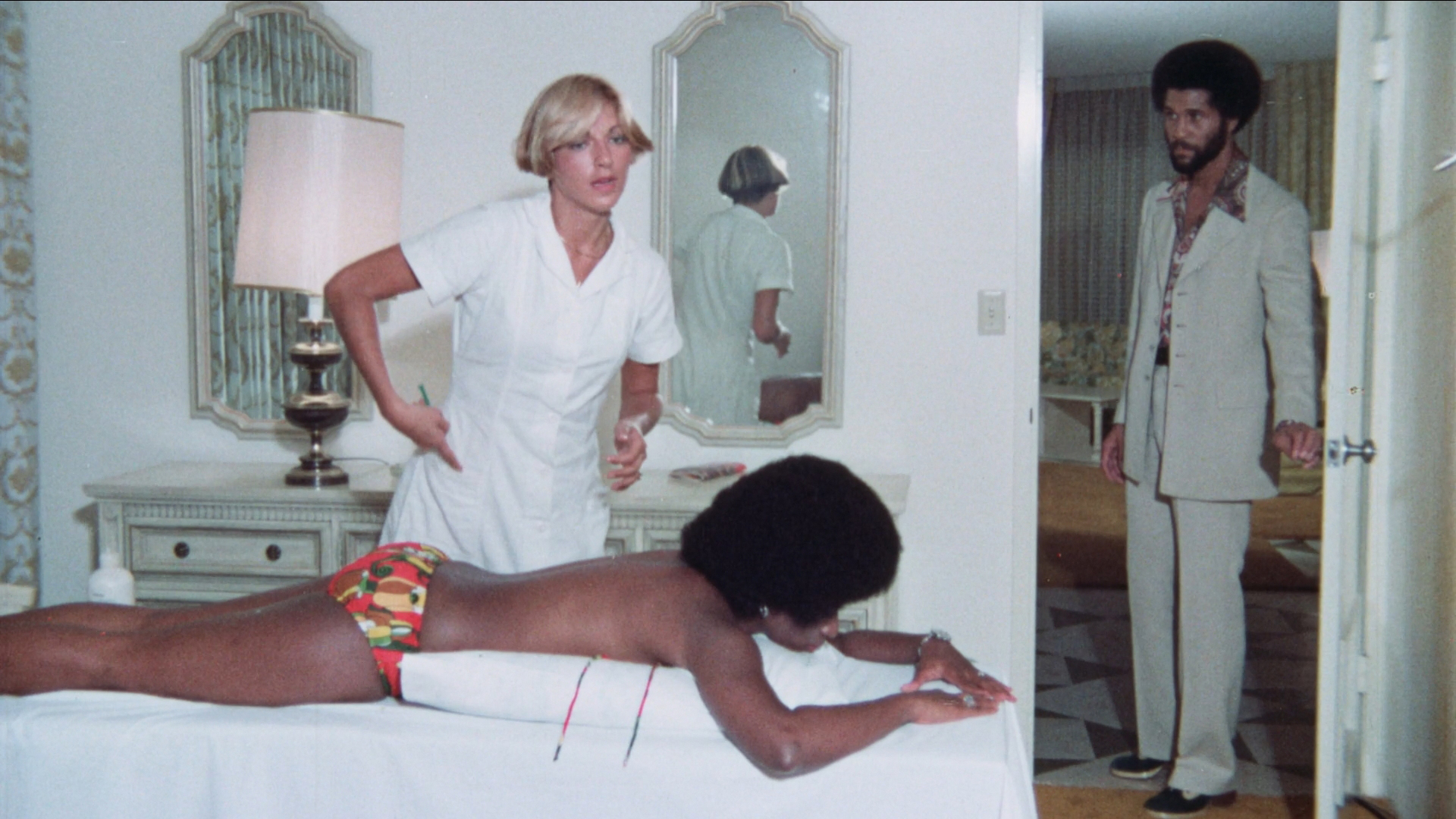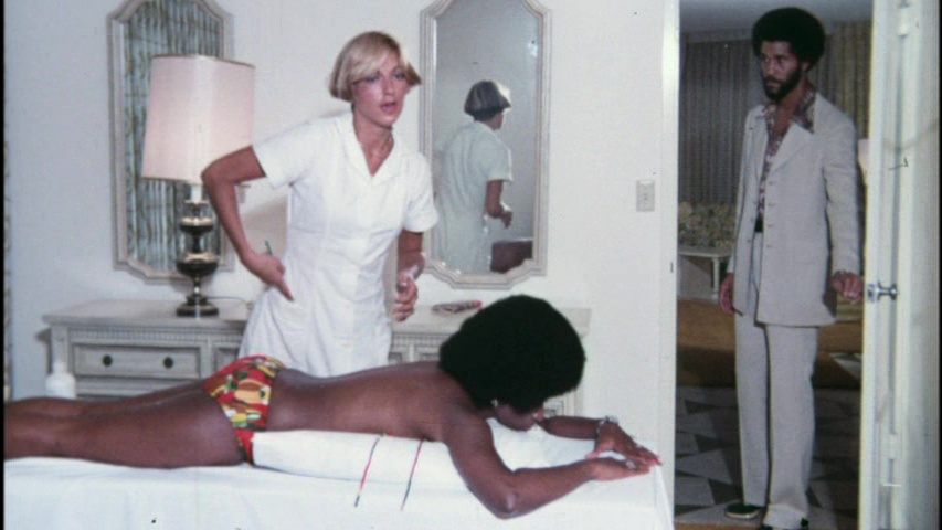 Our pre-credits scene kicks off at a cabin where some thug kidnappers are holding a very cranky black woman hostage; she gets especially indignant when she's told an "African princess" is being nabbed to come keep her company. Then it's off to funky credits central as our hero, Harlem private eye Al Connors (jazz vocalist The Guy from HarlemHawkins in his only feature role), cruises the streets of Miami. At his office he's contacted by his old buddy, David McLeod (Harris), who helped him through some "rough spots" in the past and now wears an amazing The Guy from Harlempink suit for some reason. Turns out some representatives from "an African nation" are going to be meeting with the Secretary of State, and some "foreign powers" are bent on interfering. There's also a leak somewhere in the CIA, which is why they need Al to pose as the spouse of the chief of state's wife to keep her safe. Also: "You want to know if she's cute? Yes. But remember, international repercussions. Yes, she's cute." Needless to say, our hound private eye has a tough time resisting his new charge, who likes topless massages and cuddles up close to him on the couch. Of course, it's just a matter of time before she's snatched by the minions of the nefarious Big Daddy (Crawford), which means our vest-wearing hero has to double down on the bad guys to get her back.