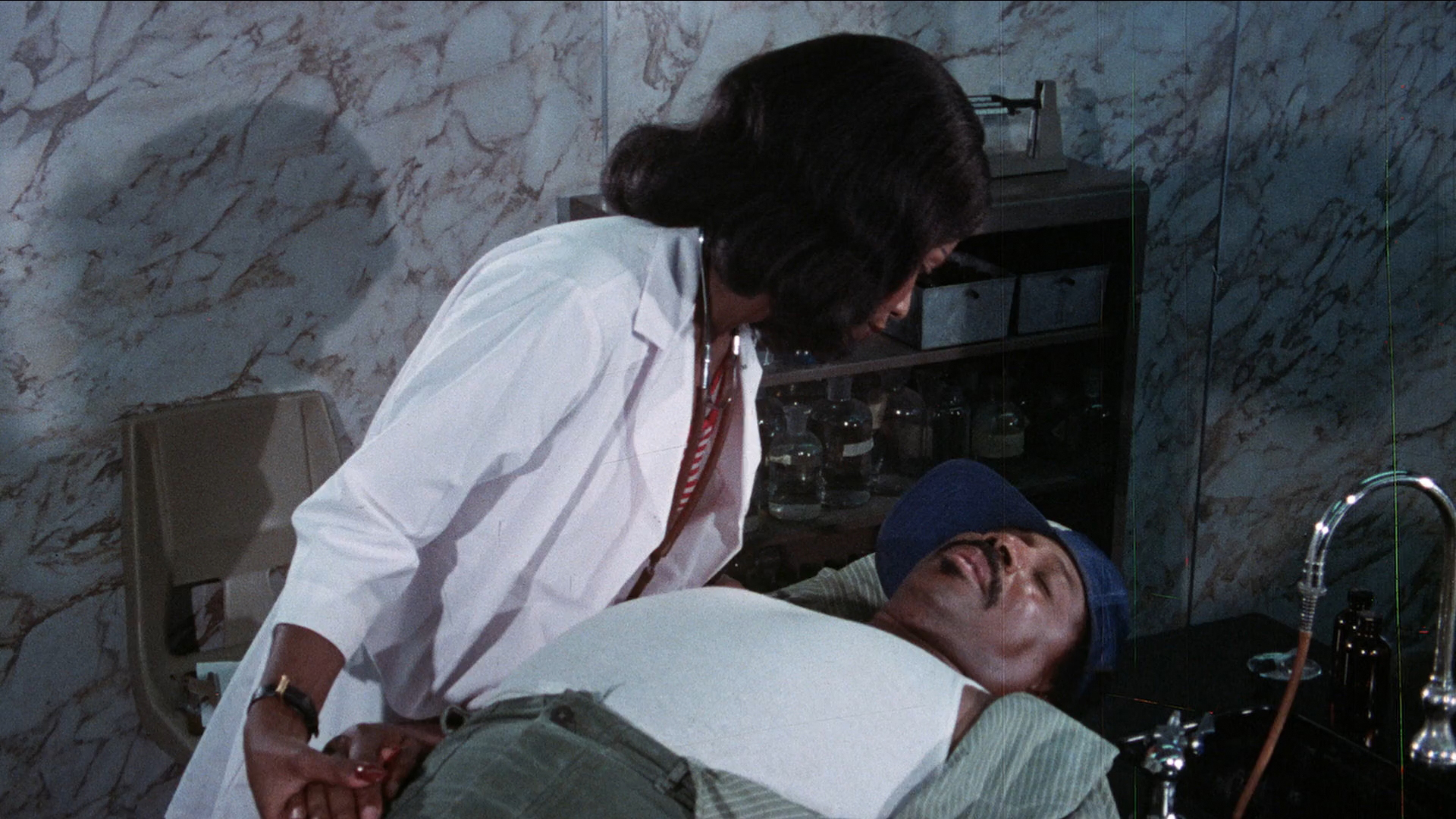 We first meet our villains in an office/lab where midget scientist Dr. Dippy (The Funhouse's Conrad) is using lab rats to perfect his new formula, which makes the subject impervious to death and capable of super strength. Unfortunately the miracle drug also kills its recipients within a matter of days, so he also needs to come up with an antidote. His sponsors, criminal duo Bob (Latimore) and Jim (Cross), aren't too keen on waiting around to set up their first score, so they decide to go ahead and find their first unwilling test subject: Steve (comic "Wildman" Steve, a.k.a. Steve Gallon, previously seen opposite Rudy Ray Moore in Petey Wheatstraw), a cheerful bum who gets sweet talked into going along with their plans. Super Soul BrotherThat includes drug injections in his posterior Super Soul Brother(which is funny because, you know, butts), and the booty humor continues when they set him up with female company to indulge his passion for having his heinie cleaned, just like his mama used to do. Steve strikes up a romance with the doctor's nurse, Peggy (Norris), which factors into the complications that ensue when it's time to test out Steve's new abilities, including bending metal rods and lifting a heavy safe to make off with the diamonds inside.