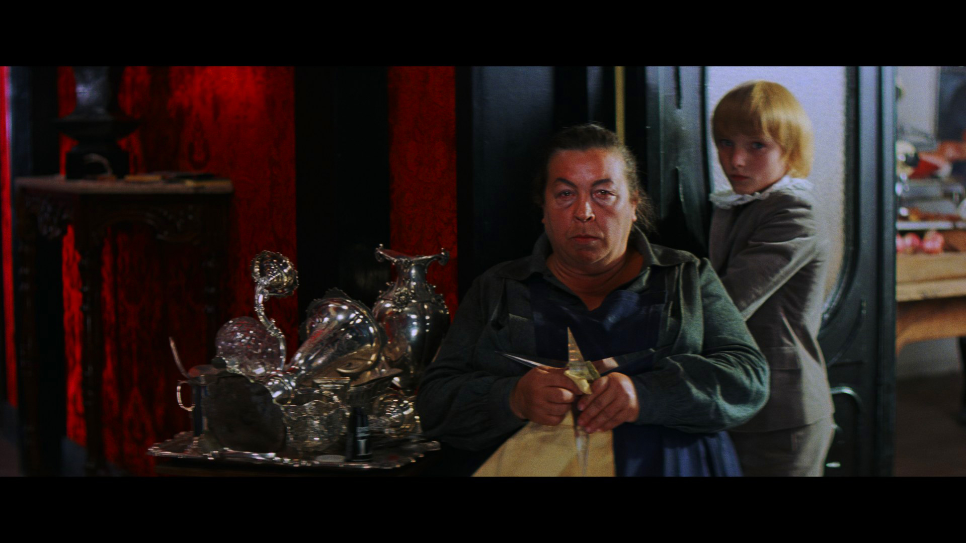 shouted statement at the front door during the rainstorm is now partially silent, making it impossible to make out her words even when one knows what she is saying; after Pat says "I'd like to dry off" at the beginning, the door slam behind her is now a soft thud instead of the earlier split-channel slam; the eyes glaring at Pat through the window are accompanied by a shorter, more muted sound effect stinger; the cries of "Help me" during the first murder have been reduced and are much softer; the growling heard inside the school hallway when Albert is attacked by the seeing eye dog is different and much more subdued; the whispering voices emanating during the beginning of Sarah's nocturnal pursuit through the building are not the same, and the sounds heard during the close up of the razor being removed are edited differently. On the other hand, when Suzy observes Madame Blanc and company undergo their witch ritual, Miss Tanner has a previously obscured line of dialogue when she leans forward: "She wouldn't eat or drink anything this evening." The thunder effects which occur in the same scene to coincide with the red flashes of light (as Blanc utters "Sickness! Sickness!") are now missing, too. Also oddly enough, the screaming voices heard over the end credits music are gone, leaving instead Goblin's frenzied middle movement of the main title theme. This release also marks the first availability of Suspiria with captions, and while this addition helps clarify a few lines of dialogue, it also contains quite a few errors and makes for hilarious reading when the captioner tries (and fails) to translate the Goblin music ("La la la la la la la -- Wait!"). The Italian audio is included but, since it can only be viewed with those captions, is pretty useless here.
