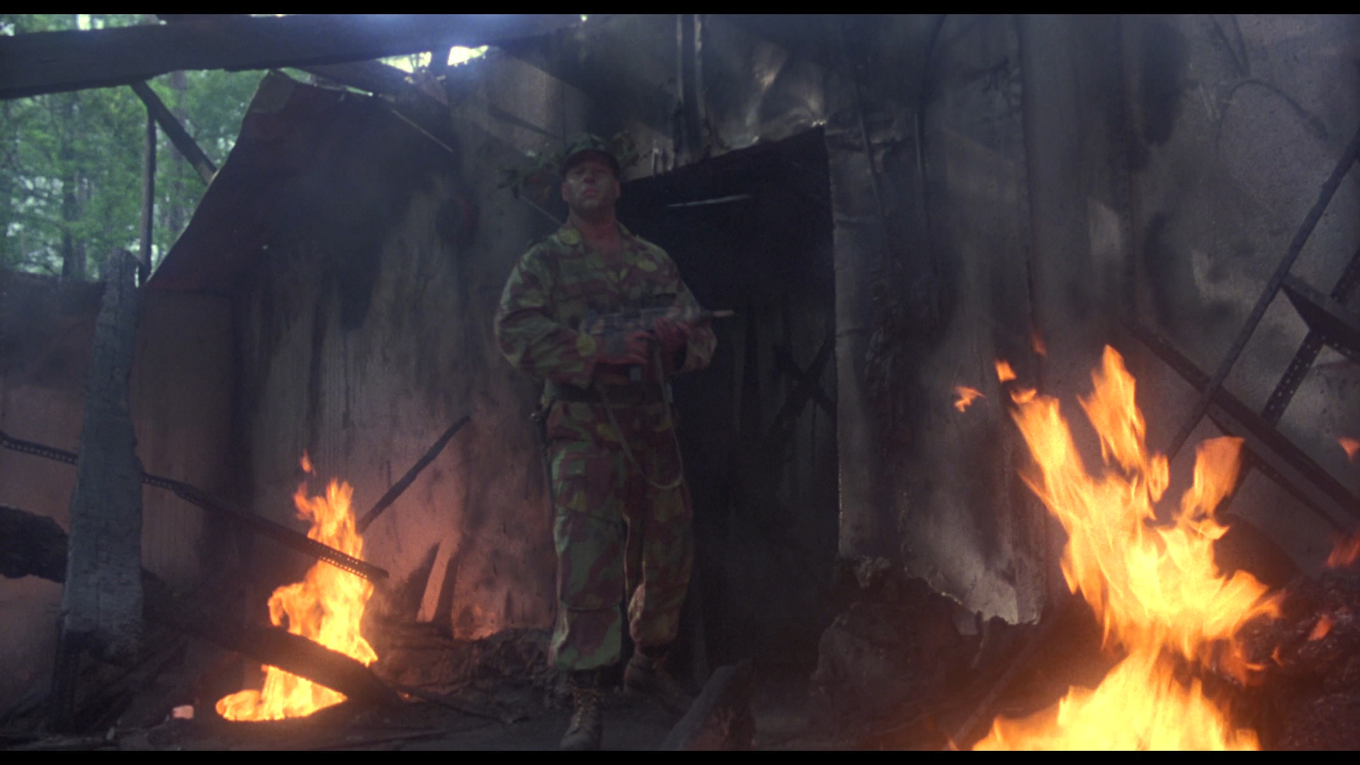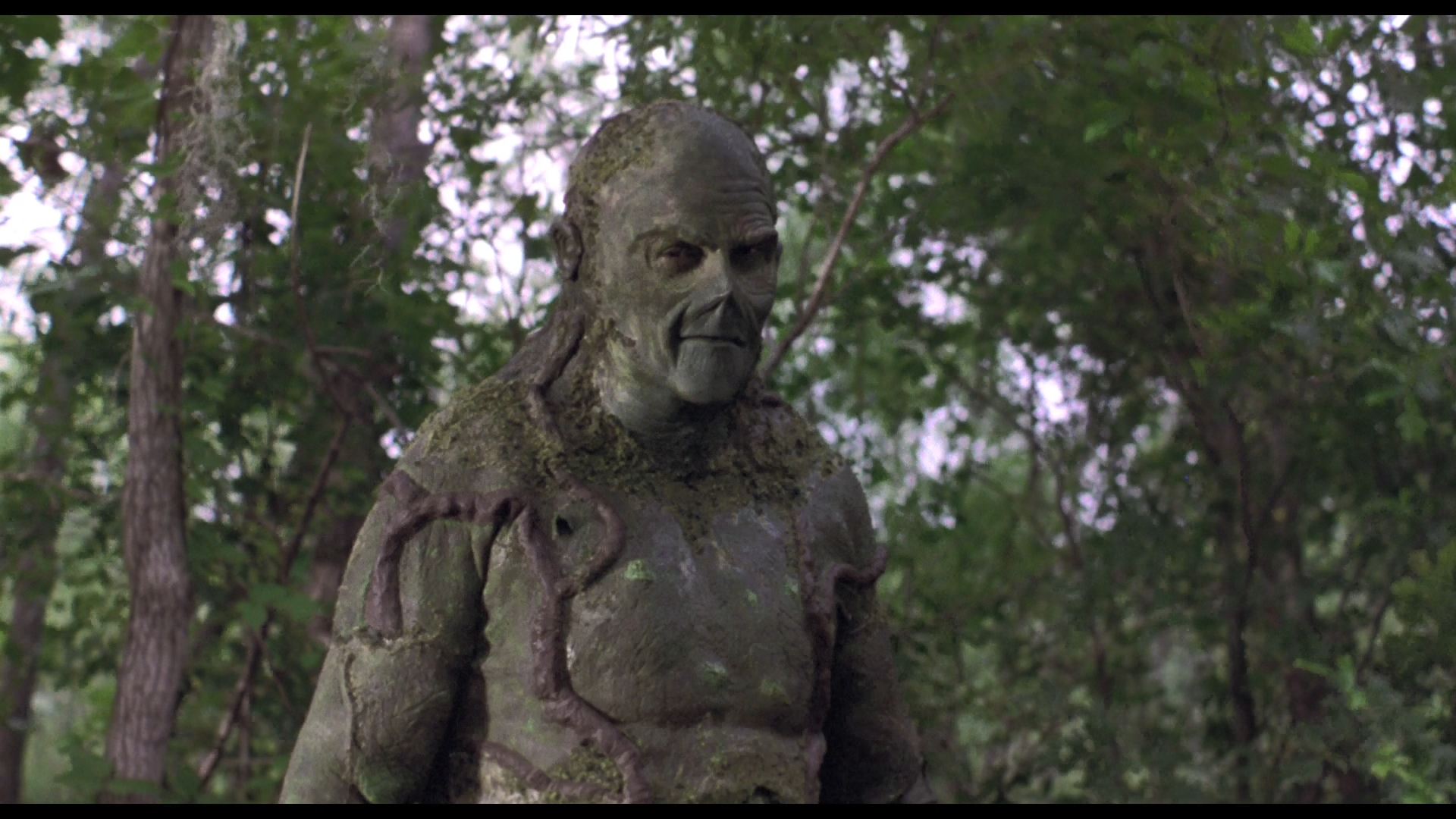 poster, and a photobook with stills and lobby cards from the MGM vaults. Like the prior two releases it's culled from a scan supplied by MGM and looks quite pleasing (definitely fresher than it did in theaters), with the European release looking just a shade darker and slightly more saturated. (Frame grabs in the body of this review are from the 88 Films release.) Optional English SDH subtitles are also included for the usual DTS-HD MA English 2.0 track. In addition to the trailer, the disc includes two new featurettes: "Swamp Screen: Designing DC's Main Monster" (20m32s) with production designer Robb Wilson King and "From Krug to Comics: How the Mainstream Shaped a Radical Genre Voice" (17m34s) with critic Kim Newman. The former is obviously completely production focused as King chats about focusing on the fairy tale atmosphere and the research involved in capturing the right look established in the comic, while the latter analyzes the evolution of Craven's career from his early confrontational, extreme horror offerings into the more commercial genre fare that defined him in the 1980s, as well as Swamp Thing's place in the canon of monster heroes in mainstream comics.