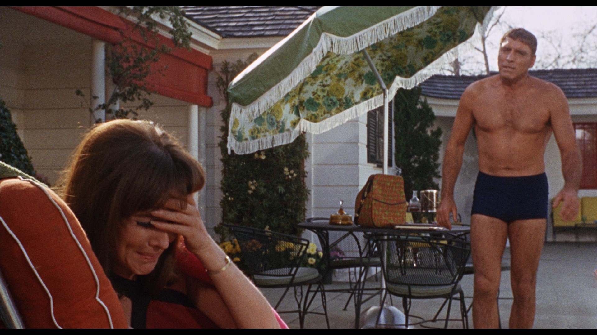 A TCM Film Festival interview from 2013 is a nice addition as well, clocking in just under 18 minutes with Marge Champion (still spry at 94 years old) interviewed by director Allison Anders. The focus is on The Swimmer at first, but other topics are covered as well including her role in Showboat (and the one showbiz venue she never explored, burlesque!). There's also a 25-minute audio reading of the short story by Cheever himself (who has a fleeting cameo in the film), a massive set of galleries (Frank Perry's storyboards, two sets of production stills, shots of Landgard, a look at the deleted scenes filmed with Barbara Loden before she was replaced by Janice Rule, U.S. and international marketing materials, and a DVD-Rom pdf of the screenplay. The American theatrical trailer is included ("The drama of a man suddenly plunged off the deep end of life!") along with five TV spots. Also included are filmographies for Frank and Eleanor Perry and Janet Landgard, plus a liner notes booklet with an appraisal by director Stuart Gordon and a handy, very articulate essay by Innis about the film's turbulent history. A subsequent reissue added in a soundtrack CD as well.