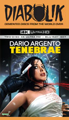 In 2022, following the pattern of Phenomena, Synapse Films and Arrow Video debuted Tenebrae on UHD in the U.S. and U.K. respectively, with the 4K presentation and extras identical either way with only the company logos at the beginning changing out. The Synapse one was first a limited three-disc set with a couple of different packaging options, featuring two UHDs and a Blu-ray. The second UHD, only in the limited edition,