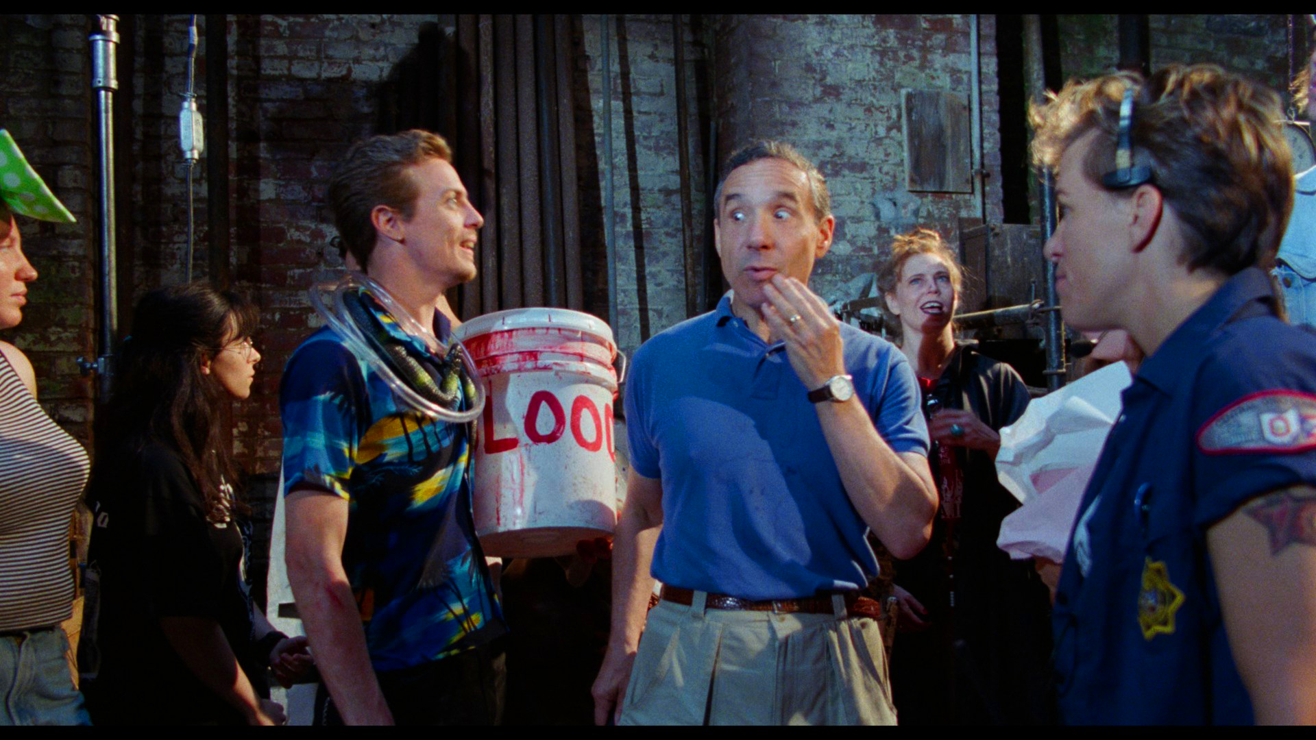 where the blind, clueless director Larry Benjamin (Kaufman) is surrounded by a cast and crew of unhinged eccentrics. Among the more grounded of the employees is Jennifer (LaTourelle), a production assistant being fought over by two men, sound