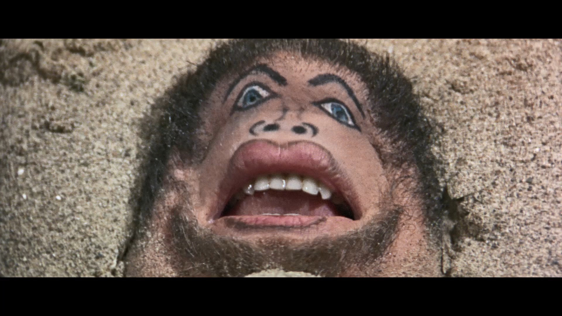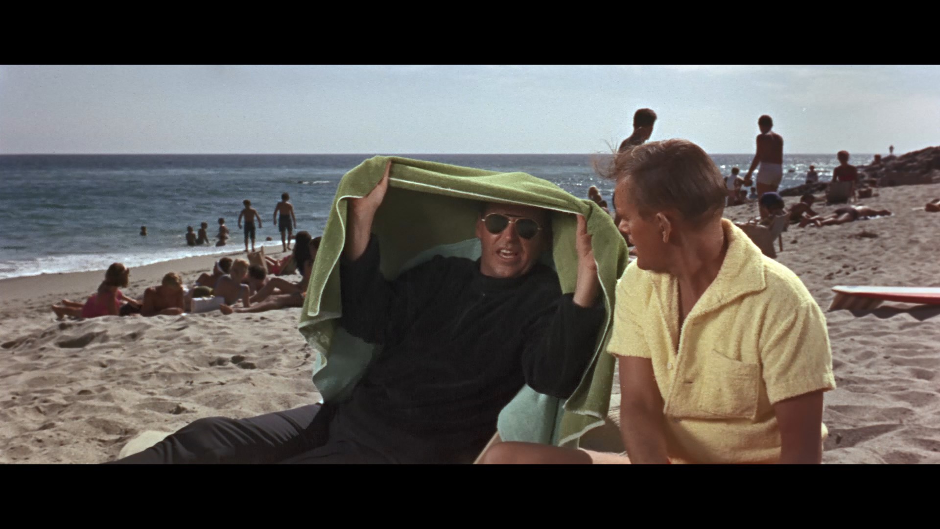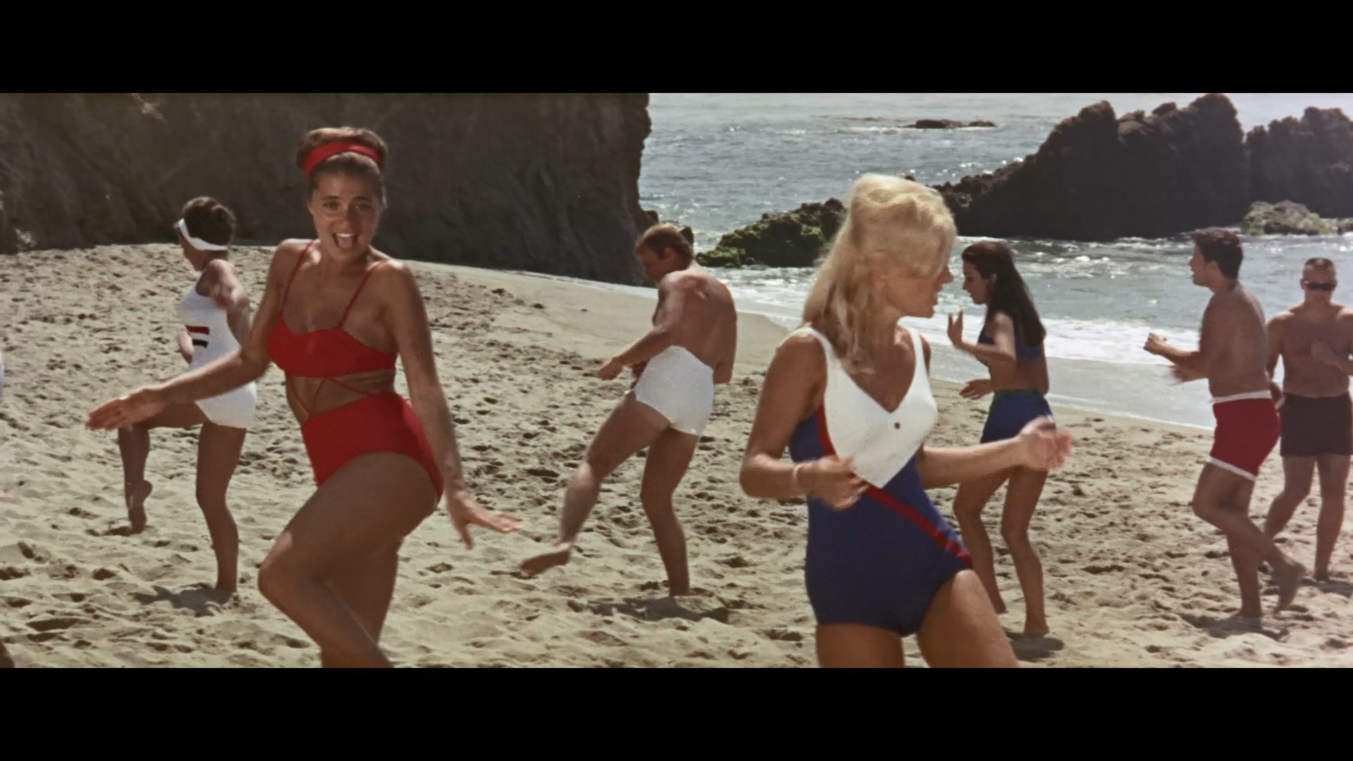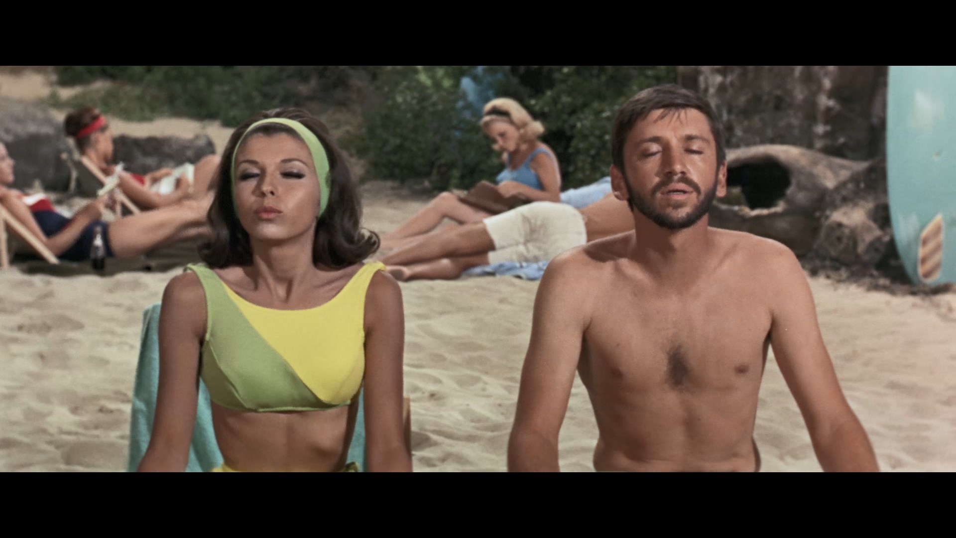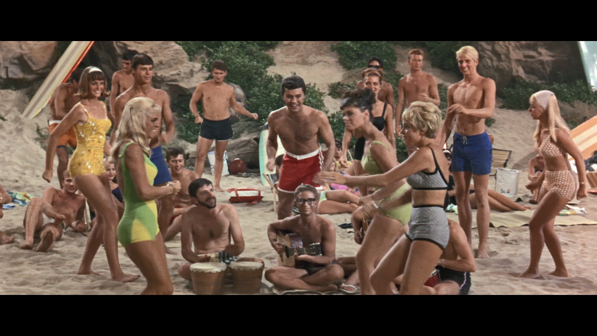 letterboxed upgrade later turned up in the '00s on MGM HD, which at least made the film much easier on the eyes. That means it didn't get a home video release of any kind until 2021 when Scorpion Releasing issued it on Blu-ray and DVD via Kino Lorber. As usual it's a solid MGM catalog scan with very bright, punchy colors and good detail that doesn't scrub away any of the natural grain where it's needed; if you've seen the (far too few) earlier beach party films out on Blu-ray, you'll have an idea of what to expect here. The DTS-HD MA English 2.0 mono track (with optional English SDH subtitles) sounds fine for a fairly typical, basic sound mix from the era with the songs coming off dynamic enough to hold your interest. The scope theatrical trailer is also included (in really nice shape) along with bonus ones for Slow Dancing in the Big City, Johnny Cool, The Tamarind Seed, and The Sailor Who Fell from Grace with the Sea, which would be the most perverse beach co-feature for this movie imaginable.