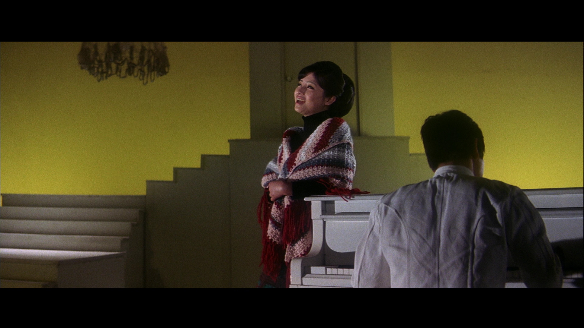 While the film was shot in full 2.35:1 scope, Criterion's first non-anamorphic transfer for laserdisc and a 1999 DVD was squeezed out enough to give the characters' heads an irritating oblong appearance. Also, it didn't remotely live up to the box's hyperbolic claims of "a lush color transfer from the original, glorious Nikkatsu-scope master." The colors were actually pretty dull and washed out most of the time, with far too much contrast in the skin tones. The English subtitles were optional, allowing you to gawk at some of the more outlandish camera setups without the impediment of words plastered across the screen. Manohla Dargis' generally informative liner notes referred to the opening sequence (presented in black and white in this print) as being "tinted a bilious green," which makes one wonder about the condition of the print she watched. The opening is supposed to be monochrome, with deliberately extreme contrast and graininess to give it a roughed-up texture. The DVD also included an endearing interview with Suzuki in which he describes his maverick filmmaking decisions, which eventually led to his banishment from the Japanese movie studio system.