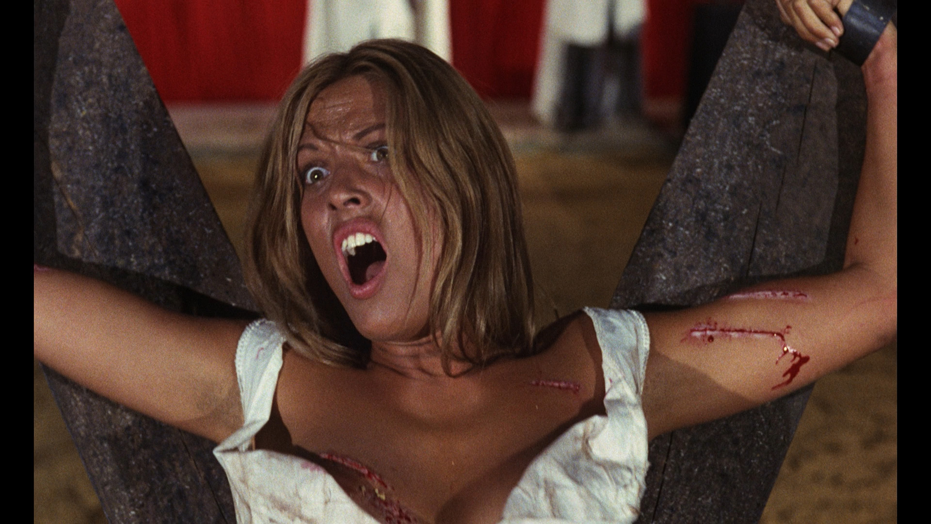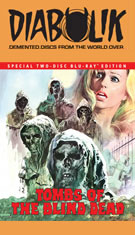 In 2022, Synapse Films released the first widely available English-friendly Blu-ray of the film (pricey Spanish and German options was out there but tough to get), presented as a limited three-disc steelbook release and a slipcover option including a "Tribute to the Templars" audio CD and an insert booklet with an essay by Patrick McCabe. The general retail version from 2023 features both of the Blu-rays as well, and it's a beauty with an immaculate restoration from the camera negative with the uncut version on disc one boasting LPCM 2.0 mono Spanish or hybrid English-Spanish audio options with optional English subtitles for either, plus SDH subs for the hybrid track. Three audio commentary options are included -- including one with Fleming sharing tons of recollections about her entire career and her memories of this film and her director. She has excellent recall, and it's a lively track that Spanish horror films will love as she provides an engaging snapshot of Tombs of the Blind Deadthe industry Tombs of the Blind Deadmostly revolving around Madrid. A solo track by Troy Howarth covers all the bases about the film's shooting locations and major participants while also offering some intriguing insights into the film's temporal experimentation, while a join one with the NashyCast podcast's Rod Barnett and Troy Guinn dives into the Spanish horror scene in general and really goes into the history of Ossorio and the creation of the film's soundtrack. The feature-length Marauders from the Mediterranean: The Macabre Magic of the Spanish Zombie Movie (88m55s) kicks off with John Russo talking about the origins and release of Night of the Living Dead before honing in on the '70s Spanish horror wave with Stiges Film Festival deputy director Mike Hostench, John Martin, Kim Newman, Steve Jones, Calum Waddell, The Living Dead at Manchester Morgue director Jorge Grau, Fleming, Helga Liné, Manuel de Blas, Antonio Mayans, Jack Taylor, and Paul Naschy’s son Sergio Molina. It's a fun survey of a fairly short period of genre history, touching on all four of the Blind Dead films in depth while also touching on Jess Franco, some of Naschy's films, Horror Express, and more. Ported over from the German release is "Awaking of Spanish Horror Cinema (14m25s) with Marcus Stiglegger analyzing the film's significance as ground zero for the '70s local horror renaissance and a key part of Spain's commercial viability in the genre, while Salem Pop's "Templar's Tears" music video (3m22s) is also a German carryover. Also included is the jaw-dropping U.S. reissue title sequence for Revenge of Planet Ape (3m24s), a bizarre attempt to position this film as an implied part of the Planet of the Apes series with the Templar now blinded simians out for payback against the human race(!). Finally you get the English trailer and a still gallery, while the second Blu-ray features the abbreviated The Blind Dead U.S. cut in identical quality with optional English SDH subtitles.
