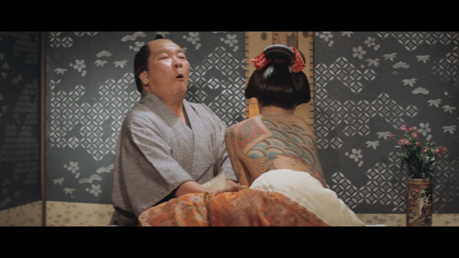 to pay off her debt and becomes the latest obsession of tattoo artists Horihide (Yoshida), the nice(ish) guy, and Horitatsu, whose work is "filled with an aura of imminent violence." After multiple violent developments, more elements turn up including comic cross dressing, a fateful ocean voyage, a horrific market for tattooed virgins, Horhide's former girlfriend and current enslaved geisha Osuzu (Tachibana), an elaborate escape attempt, and a scheming, drug-dispensing madam (Fujimoto), who holds sway over them all.