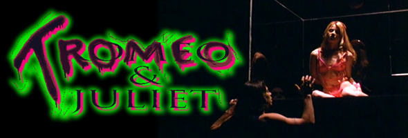The video history of Tromeo and Juliet is even more complex than usual for a Troma film. VHS saw two incarnations of the film, an unrated director's cut and an extensively edited R-rated cut that really makes no sense at all. The uncut version was also released as a letterboxed laserdisc that quickly drew fire from fans as the film was shot full frame and didn't really lend itself well to being matted off to 1.85:1; in particular, a lot of nudity and monstrous make-up was lost in the process. The DVD edition followed shortly afterwards and wisely remained unmatted, a presentation that remains the standard to this day.