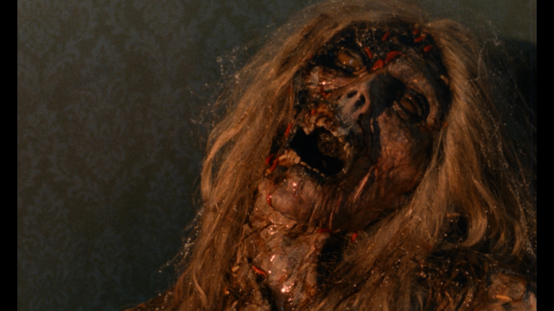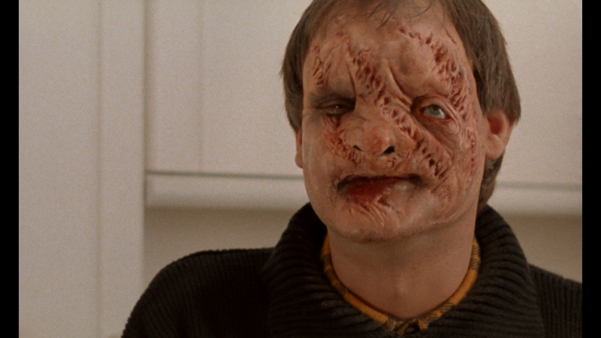 refurbishing a title few would have expected to see in pristine shape. The new transfer, a 2K scan from the 35mm internegative, is a massive leap over the old VHS, obviously, and keeps the original grainy aesthetic of the film intact while featuring satisfying detail levels and sometimes striking primary color schemes. The DTS-HD MA English mono audio track is extremely basic and flat, but that's the nature of the original recording; optional English SDH subtitles are provided. Two audio commentaries are also provided, the first featuring director Anders Palm with film journalist David Flint; then you get producer Mark Cutforth in conversation with Peter Kuplowsky and Justin Decloux of Laser Blast Film Society. Both are chock full of info and cover everything you could want to know about the fundraising process, the impact of Friday the 13th on the production, the special effects connection to Hellraiser, the lack of genre respect in the U.K. at the time, the influence of Udo Kier's Blood for Dracula performance, the casting process, the horror-comedy balance, the tiny size of the crew, and plenty more. The original, very spoiler-heavy trailer is also included (under the Hand of Death title, just like the main feature here) along with a gallery (2m44s) of fun production photos and other ephemera from Cutforth's collection, including a random shot of Kier for good measure. The title is also available as a limited 2,000-unit slipcover edition designed by Earl Kellser Jr.