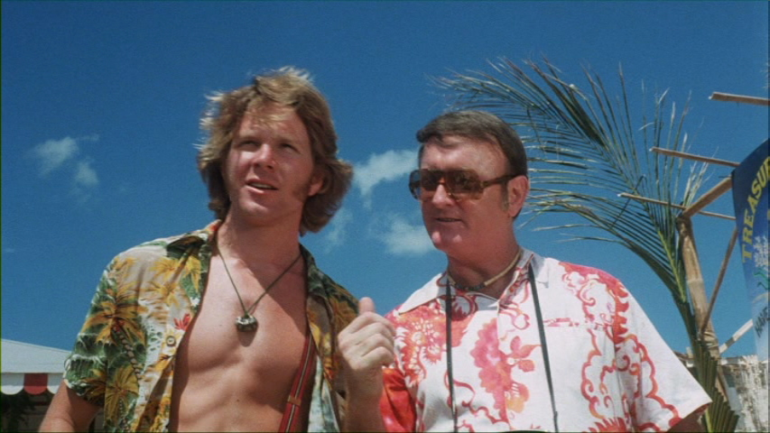 As anyone old enough to remember disco can attest, the late '70s were a cinematic feeding frenzy of ridiculous Jaws copies ranging from the furry (Grizzly) to the, err, porny (Gums and Tintorera). However, they don't come much cheaper or dumber than Up from the Depths, a New World quickie shot in the Philippines (trying to pass for Hawaii) which appears to be random chunks of footage strewn together with only the vaguest semblance of a plot. The late Sam Bottoms, a good actor with Apocalypse Now opening the exact same year, somehow got roped into growing some weird sideburns and running around in an open Hawaiian shirt for over an hour as Greg Oliver, who helps a hotel's ship captain trick guests into low-rent water tours. Unfortunately the guests are getting chomped by some mysterious creature out in the water, which seems to have a special fondness for scuba divers. Turns out the culprit is some sort of giant prehistoric dolphin-y thing that's only seen in brief flashes and highly unconvincing overhead shots as an oversized set of fins, and it's up to the hotel guests and staff to dispatch it before more tourists wind up as fish food.