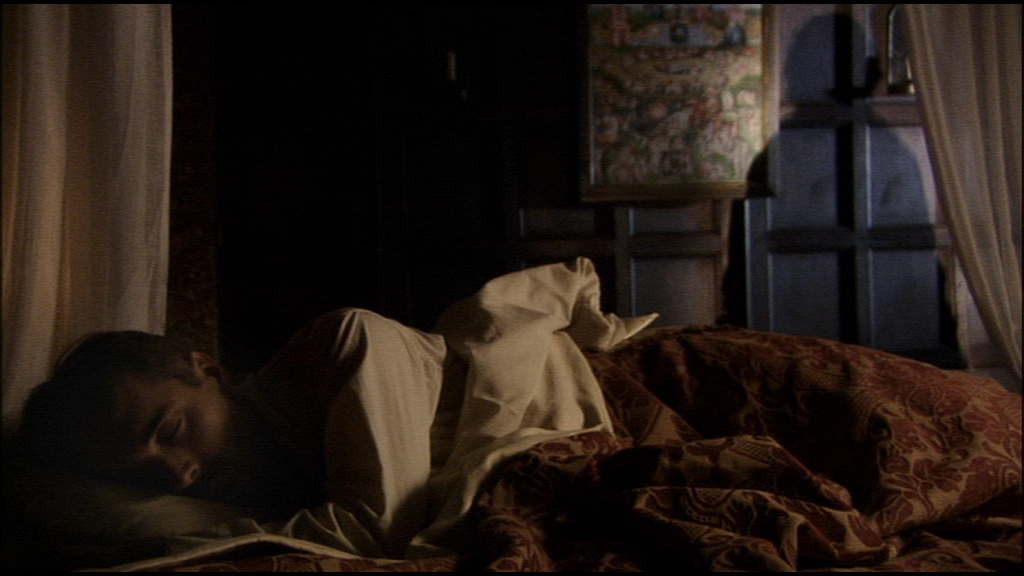 The following year saw another new yuletide episode, this one adapted from the more familiar James story "Number 13." Adorned with a mustache, the very good TV actor Greg Wise (who appeared in Sense and Sensibility and went on to marry Emma Thompson) takes charge here as the studious Professor Anderson, who causes some difficulty at his hotel when they can't seem to provide a room complete with both a comfortable bed and a good working desk. Finally he finds what he wants in Room 12, which is situated next to Room 14... with no number 13 between them. Another scholar had disappeared on the premises suddenly without paying his bill, so he has to pay upfront before beginning his work-- which takes him into a dark history involving witchcraft, local scandal, and Heironymous Bosch's painting, "The Garden of Earthly Delights." Most unsettlingly, in the middle of the night he hears disturbances... and when he walks outside, Room 13 is suddenly situated next door. What's inside the room, and can he unravel its mystery before the demonic danger inside claims him?