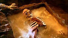 However, it's the hammy supporting characters here who are the real show, with all of the actors (most weirdly dubbed in post-production for some reason) acting as strangely as possible among the cheap desert sets. Select doses of previous Corman scores (including some recognizable snatches of James Horner music) add more color to an obviously threadbare production, and director John C. Broderick (best known for the drive-in trash favorite Bad Georgia Road) keeps things movign very quickly for the trim 81-minute running time. Of all the Corman sword films, this is certainly far from the worse and quite entertaining if you're in the right frame of mind. Shout Factory's disc (available officially through their Direct line, found at the link above) features an anamorphic transfer that's several huge steps ahead of the murky, washed-out Vestron VHS tape and the later New Concorde DVD which recycled an old one-inch tape master. This new transfer features some significant damage during the opening credits, but otherwise it's crisp and colorful with only some minor debris issues to speak of. It's obvious this won't be a Blu-Ray candidate anytime soon, but the upgrade value here is definitely substantial. The anamorphic framing also restores a lot of compositional style compared to the awkward, open matte versions we've had before.