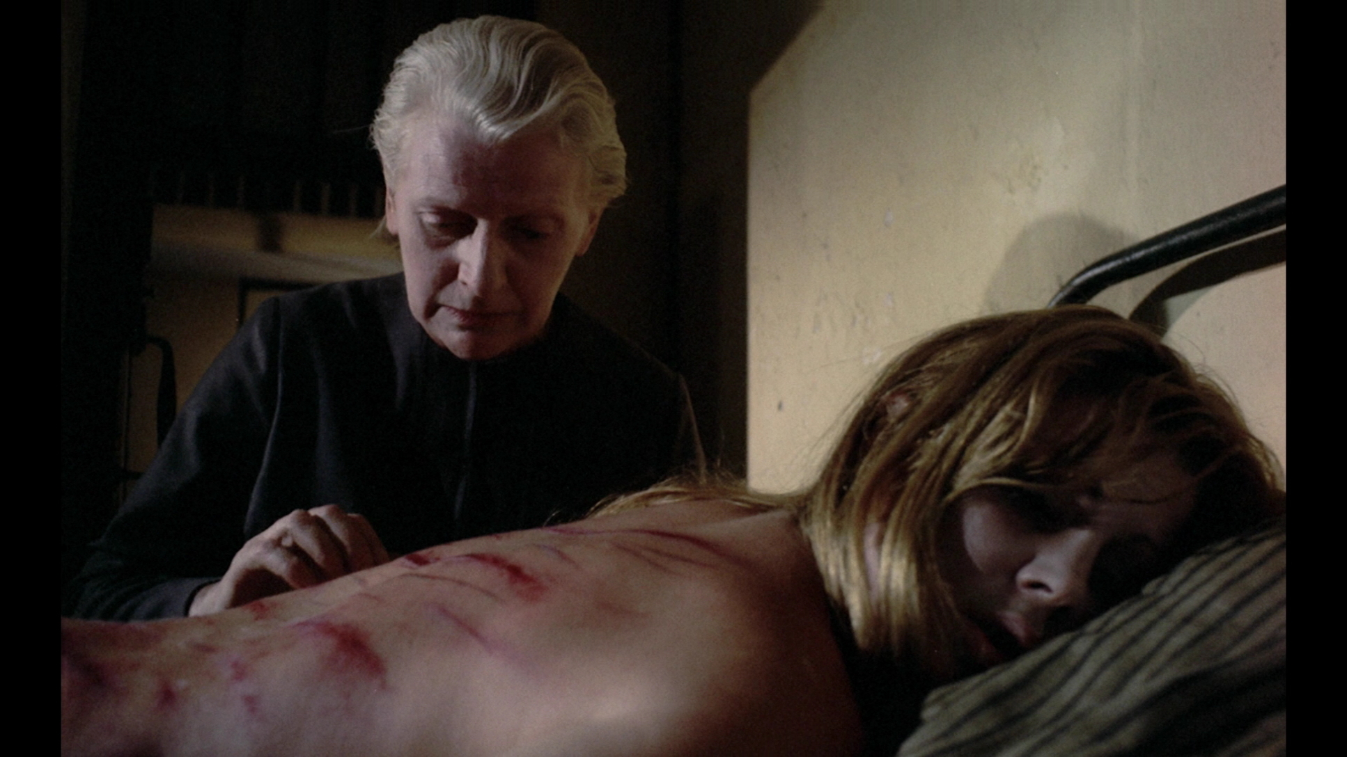 The first of those horror films, House of Whipcord, kicks off the four-disc "The Pete Walker Collection" Region A Blu-Ray set from Kino Lorber and Redemption Films, and it's an appropriate place to start. The film marks the point at which the director and writer really set their sights on the judicial and penal systems, delivering a scathing and frightening view of what happens when individuals decide to mete out justice in their own backyard. Penny Irving, a very naive young French girl exploring the swinging scene in London, hooks up with a charming, slightly sinister young man named Mark E. DeSade (Tayman). Even after Mark asks her to close her eyes, then tells her he's holding a knife to her face and swipes an ice cube across her cheek, she doesn't seem to grasp that he might not be such a wholesome character. Sure enough, Mark whisks her away to a remote estate where his mother is part of a band of concerned folks disillusioned with the British court system. Thanks to a makeshift prison ruled over by sadistic warden Sheila Keith (a wonderful Pete Walker regular), these bitter folks have managed to imprison those they deem impure or corrupt. A doddering old former judge presides over each victim, and the young girls are punished by whip for their indiscretions and escape attempts. However, our protagonist's disappearance is noticed, and her friends (including Virgin Witch's Michelle) begin the difficult process of tracking her down.