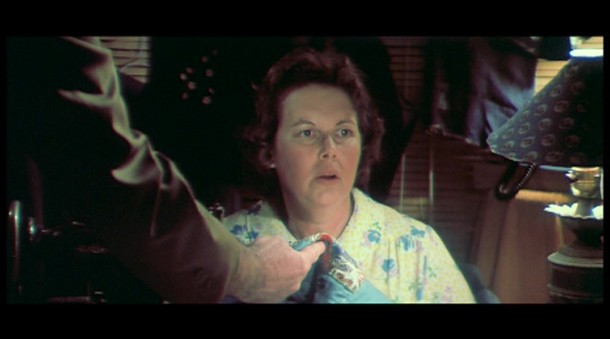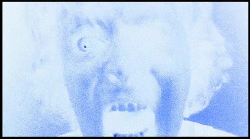 widely available film out of the bunch on home video, The Premonition hit VHS from Embassy in the '80s and made the leap to DVD in 2005 from Media Blasters under its Guilty Pleasures banner. The widescreen transfer was essentially fine for the time (more on that in a moment) with English and Spanish mono tracks plus a reworked 5.1 mix. Extras included a direor's commentary, a photo gallery, the theatrical trailer, over three minutes of TV spots, a 16-minute interview with the late Lynch, a 6-minute interview with Schnitzer, and a batch of bonus trailers (Blood Sisters, Banned, The Oracle, Just Before Dawn). The Arrow release carries over the commentary, trailer, TV spots, and two interviews, while ditching the 5.1 remix in favor of a more faithful LPCM mono version. What's fascinating is how radically different the transfer is, with significantly more image info on the sides (how much seems to vary from reel to reel as this was shot open matte and composed at the telecine operator's whims) with very different, more centered framing in many scenes. The color timing is also different with more natural flesh tones compared to the blown out ones in many scenes on the DVD, and the flashes of Sheri's visions now have stronger tinted hues (like the light blue one in the frame grab on the left) compared to the nearly desaturated ones seen on the DVD. All in all it's a much more satisfying and impressive viewing experience.