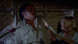 All three films are presented in new 1.78:1 anamorphic widescreen transfers and look considerably better than the flat versions released earlier from Corman's New Horizons label; in particular, Women in Cages looks the most improved, which is especially important considering how much of it takes place at night with stylized lighting. The corrected framing also balances out many shots that looked awkward and stagebound before, especially in Doll House with its abundance of carefully lit interior shots. The mono audio for each film sounds faithful to the limitations of the source material. The film are available as a two-disc set on DVD or a subsequent Blu-Ray version, with the features split the same way on both. Disc one includes The Big Doll House by itself with a wealth of extras including the trailer, teaser, and radio spot, along with a Jack Hill commentary track. As with his past efforts like Spider Baby, he's full of stories about all of the cast members and goes into great detail about his extended working relationships with Corman and Grier; in fact, he worked again with Grier and propelled her to drive-in immortality with Coffy and Foxy Brown. Also included is a new video documentary about the making of the two Hill titles, "From Manila with Love," featuring interviews with Hill, Corman, Haig, Brown, Ford, Collins, Candice Roman, Tada Bracci, producer Jane Schaffer, and screenwriter Jeames Gordon White. It's a solid and entertaining piece about a particularly wild and fearless time in exploitation cinema and would go well as a double feature with the recommended documentary, Machete Maidens Unleashed! Disc two features the other two films; Women in Cages has a trailer and TV spot, while The Big Bird Cage gets the same along with an additional Hill commentary in which he essentially picks up where he left off on the first film and talks about reuniting with many of the same cast and crew members while pushing the material to more cartoonish levels. On Blu-Ray, the increase in resolution is also a surprisingly strong factor with the films actually seeming more slick and carefully shot than one might have previously imagined; in particular, The Big Doll House is eye candy of the first order and features terrific detail with beautifully saturated colors. (Click on any of the images here for a look at them in full 1080.) A superlative release all around.
